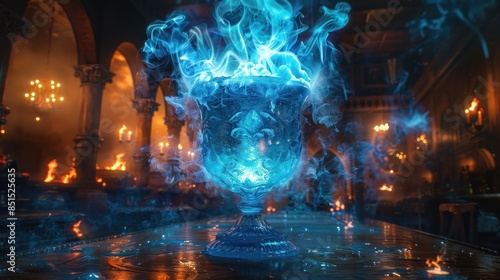 An obsidian goblet of blue fire sitting on a dining room table at night, dramatic lighting.