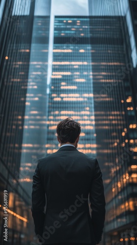 An office worker standing with his back turned in front of a tall building, seen from a low angle. Concept of the grandeur of the building symbolizing the pinnacle of one's career.