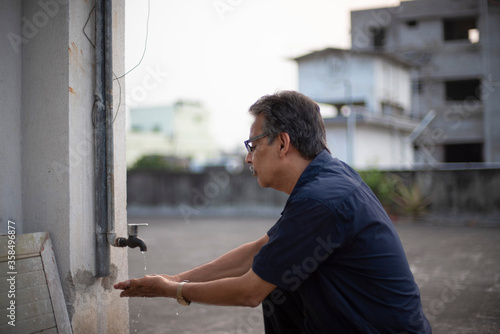 An old / aged Indian Bengali man in blue shirt is washing her hands from tap water on the rooftop under the open sky. Indian lifestyle and seniors