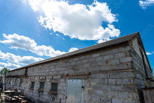 An old brick barn in the Polish countryside with a corrugated asbestos roof.