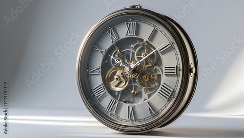 An old clock face shows the antique hour on its round metal dial with roman numbers, a vintage sign of time