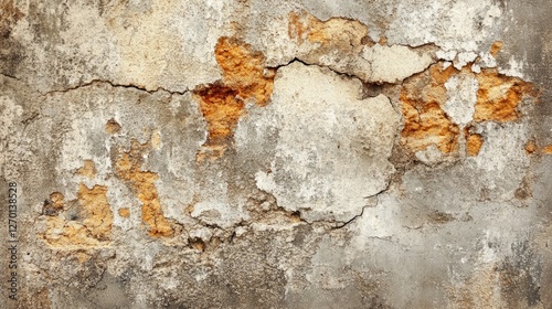 An old, distressed cement wall with visible cracks, worn patches, and rough, uneven surfaces.