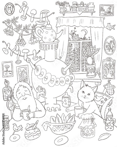 An old man and a cat are drinking tea in a cozy house. Coloring. Black and white digital illustration. Cute illustration for the decor and design of posters, postcards, prints, stickers, invitations.