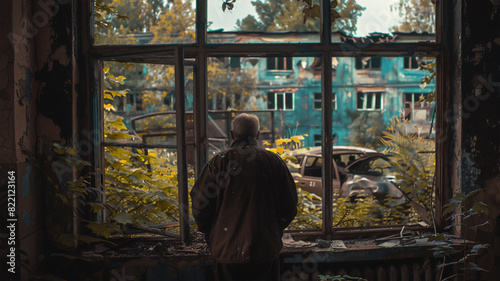 An old man at an old window, watching the aftermath of the apocalypse with crumbling buildings, abandoned cars and overgrown vegetation.