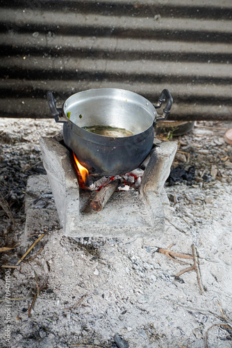 An old pot black and dented placed on top of old stove in the style of the countryside, using logs (firewood) to light the fire for cooking. There was a pile of ashes in front.
