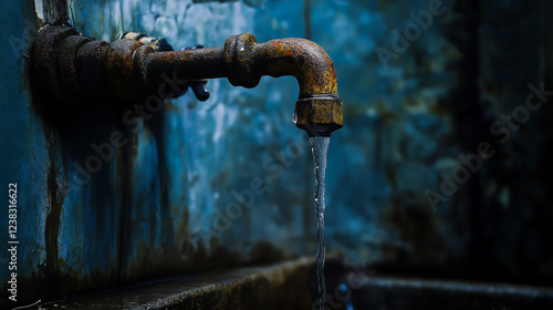 An old, rusted faucet with water slowly dripping from its spout. Water scarcity, environmental concern, and the passage of time