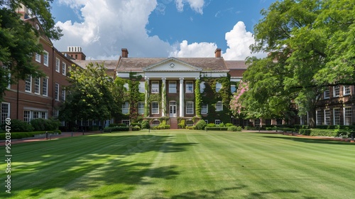 An old university building with ivy-covered walls, large pillars and beautifully manicured lawns