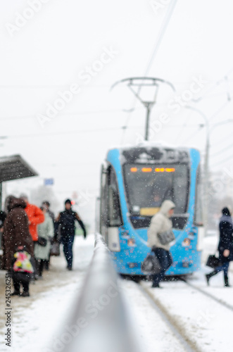 An old vintage white-and-blue tram from the city of Zurich riding in the snowy city street of the Ukrainian city of Vinnytsia. Blurred photo can be used as a background for the text.