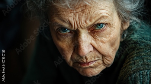 An old woman frowns and looks to the side, her face is fierce and shows clear anger. The lighting in the image emphasizes the shadows, which enhances the mood.