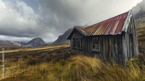 An old wooden mountain hut with rusted roof, nestled in the Scottish Highlands under stormy skies. The rugged landscape is visible behind it, and soft light filters through the clouds