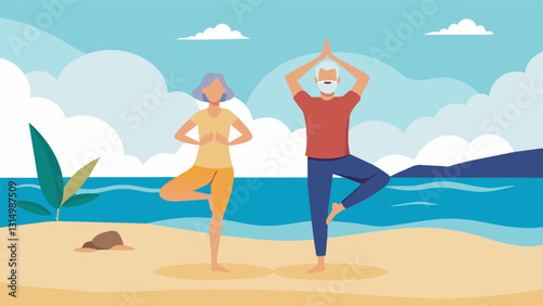 An older couple in tree pose perfectly balanced on a sandy beach while the waves crash in the distance.. Vector illustration