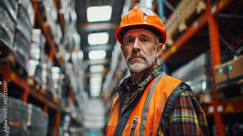 An older male warehouse worker in an orange hard hat and safety vest standing confidently in an industrial area filled with shelves, representing experience and dependability.