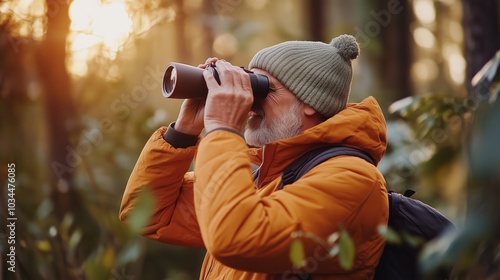 An older man in a warm jacket observes nature with binoculars during sunrise in a forest