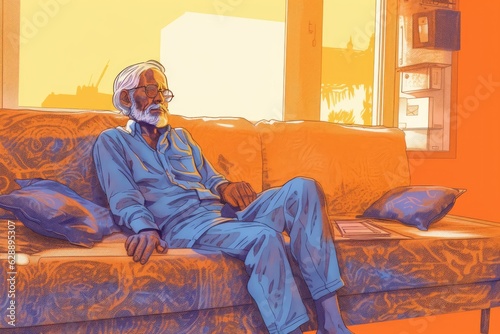 An older man sitting on a couch in a cozy living room Fictional Character Created By Generative AI