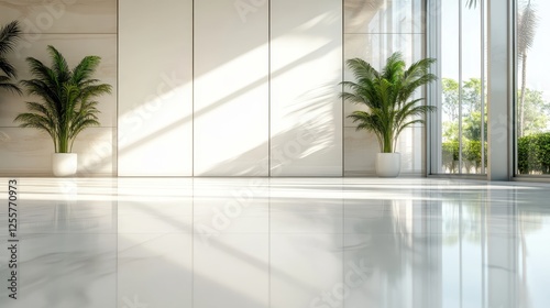 An open and bright interior space featuring tropical plants, utilizing natural light and cleanliness to convey comfort, modernity, and a connection to nature.