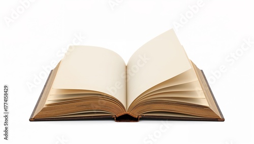 An open blank book with slightly aged pages and a dark cover