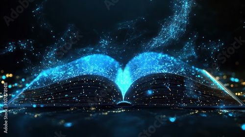 An open book emitting glowing particles, symbolizing knowledge and imagination.