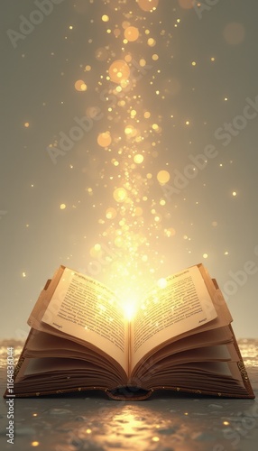 An open book radiates a warm golden glow, with shimmering particles rising from its pages against a soft, ethereal background. This enchanting image captures the essence of imagination and knowledge