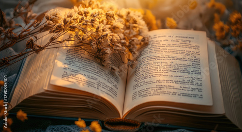 An open book surrounded by dried flowers, illuminated by soft natural light.