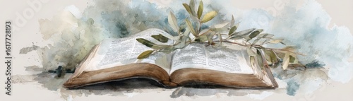 An open book with an olive branch resting on its pages, depicted in soft watercolor tones with a serene, artistic background.