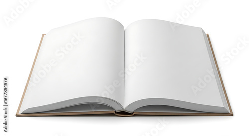 An open book with blank white pages lying flat on a white surface ready for writing or drawing on