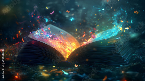 An open book with pages glowing and swirling, surrounded by colorful magical energy,