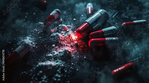 An open bottle spilling tablets and capsules on the floor, bokeh background, dark tones.