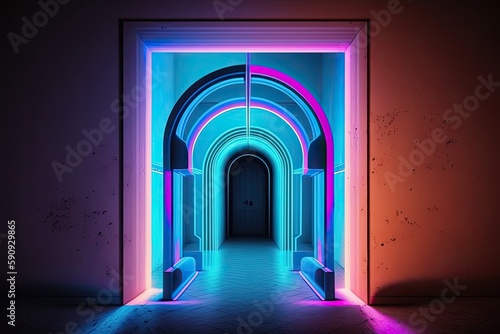 an open door leading into a dimly lit room with neon lights adding a pop of color. Generative AI