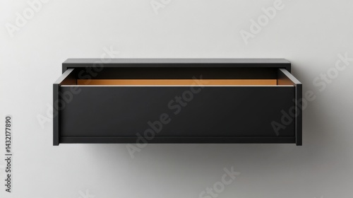 An open drawer with a matte black finish and glossy interiors, set against a light gray background