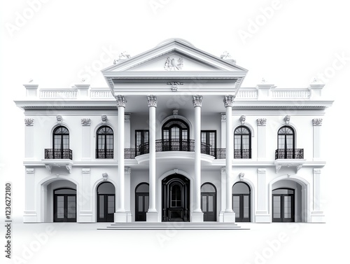 An opulent neoclassical mansion, intricate facade details, grand entrance with columns, isolated on white background