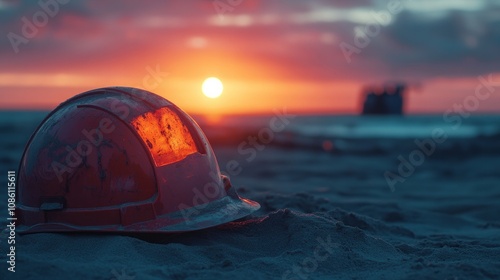An orange construction helmet against a warm sunset backdrop, symbolizing progress.