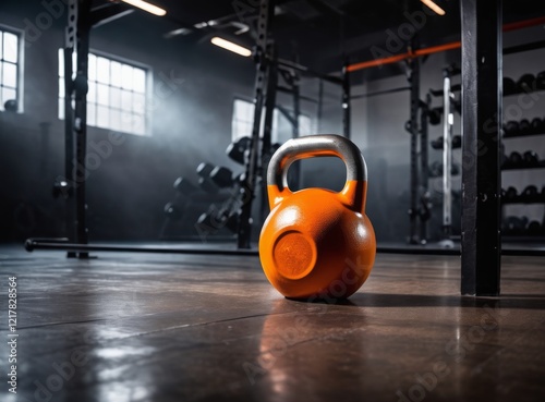 An orange kettlebell rests on a gym floor, surrounded by weights, with atmospheric lighting creating a motivating workout vibe.