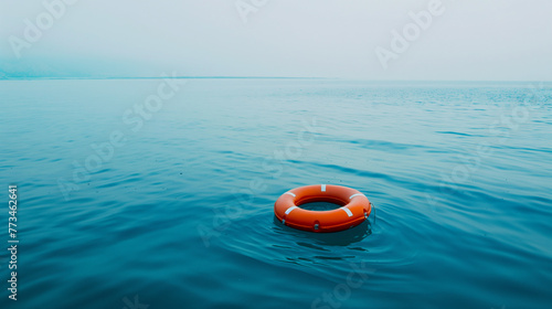 An orange lifebuoy floating in the middle of a calm sea on a foggy day