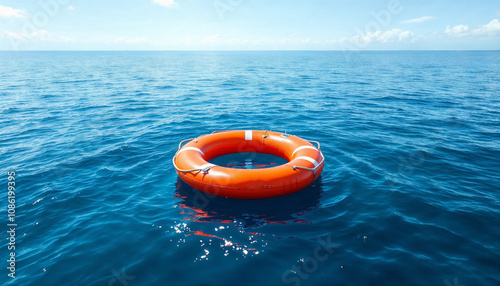 An orange lifebuoy floats on the open sea, symbolizing safety and hope under a tranquil sky.