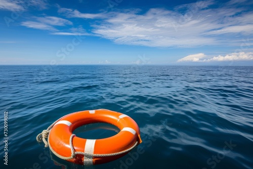 An orange lifebuoy floats on the open sea, symbolizing safety and hope under the vast sky