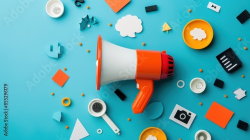 An orange megaphone surrounded by colorful geometric shapes and social media icons on a blue background.