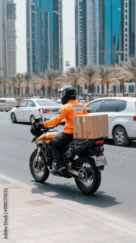 An orange-clad food delivery person rides a motorbike through the bustling streets of Dubai, skillfully maneuvering between cars while carrying a delivery box