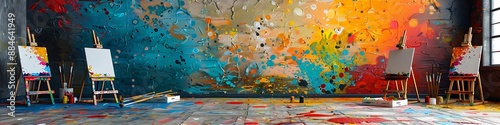 An organized art room with empty easels, paintbrushes, and a colorful paint splatter backdrop.