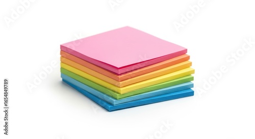 An organized stack of blank, multicolor sticky paper notes arranged in a colorful rainbow pattern, isolated on a white studio background