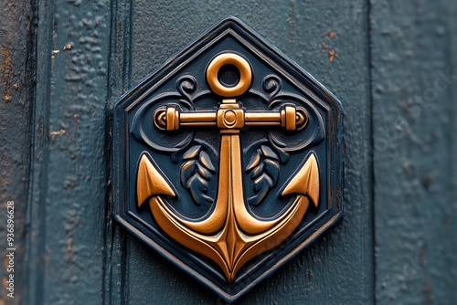 An ornate anchor emblem in gold and blue, symbolizing strength and nautical themes, perfect for marine and coastal projects.