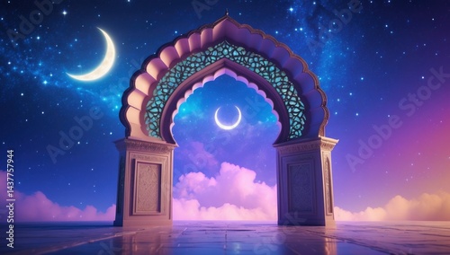 An ornate archway frames a serene night sky with a luminous crescent moon, evoking a sense of peace