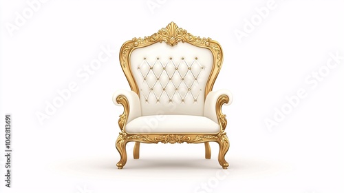 An ornate golden throne featuring detailed carvings, showcased against a white backdrop, highlights regal motifs in this elegant design.