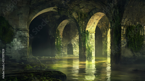 An otherworldly glow highlights the moss-covered stone arches of a primeval underground chamber, where the murmurs of bygone days resonate in the tranquil water. Glowing Murmur. Illustration