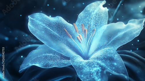 An otherworldly glowing lily with intricate ice-blue patterns, blooming in a frozen wonderland.