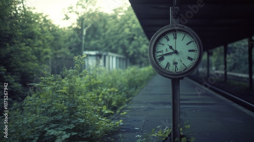 An overgrown railway platform with a lone clock suggests paused time, nature reclaiming forgotten spaces, and echoes of journeys past.