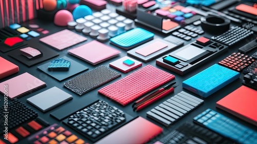 An overhead shot of an assortment of colorful rectangular objects on a dark surface in a studio