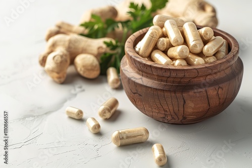 An overhead shot of raw maca root capsule organic powders in a wooden bowl set against a stark white text backdrop for a text studio, Generative AI.