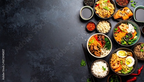 An overhead shot showcases an assortment of colorful and tasty Asian dishes arranged artfully on a textured dark background, presenting a delicious food selection.