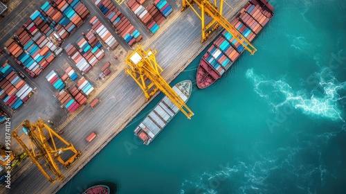 An overhead view of a busy port area with ships being loaded, stacks of containers, and heavy machinery moving goods.