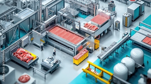 An overhead view of a meat processing factory with workers and machinery.